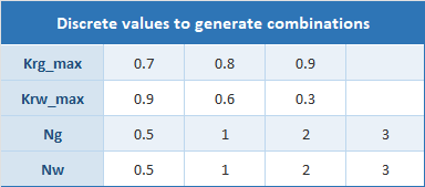 For this example, we focus on relative permeability endpoints and Corey exponents for both gas and water phases. Rather than defining continuous distributions, we use discrete values for each parameter, which are then combined to generate individual realizations.