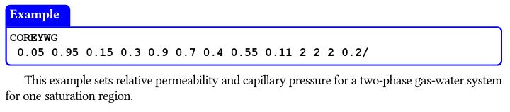 For the content of the INC file, we could use tabulated data. However, since we are running with TNav, we instead use the Corey formulation via the COREYWG keyword, which provides a much simpler functional definition.