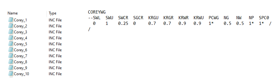 In this table, we add a final column containing the name of the INCLUDE file to be used in each simulation case. Each INC file defines the relative permeability curves for its corresponding parameter set.