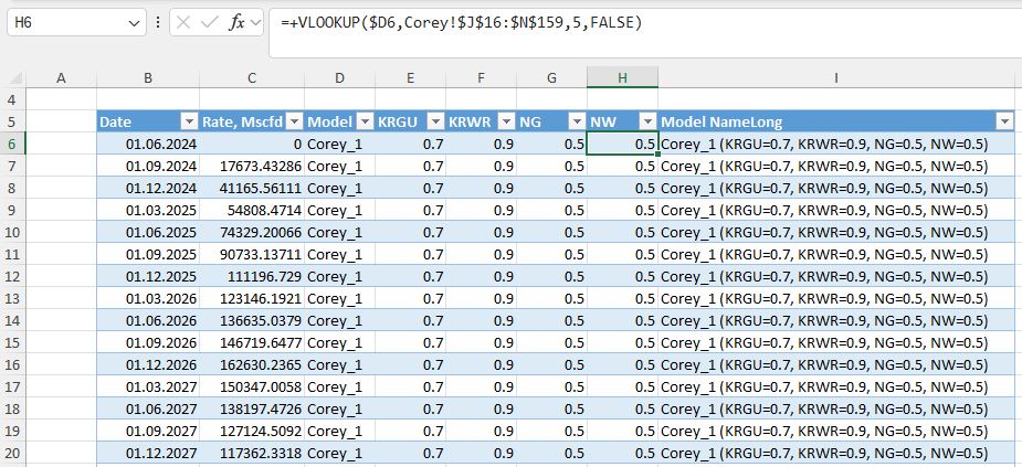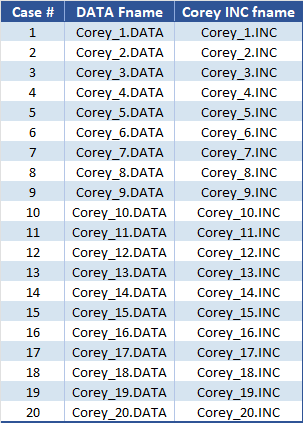 A simple VBA macro then looped through all 144 cases. For each row, it pulls the corresponding parameter values, injects them into the template, and writes the resulting text block to an ASCII file, saved as “Corey_n.INC”.