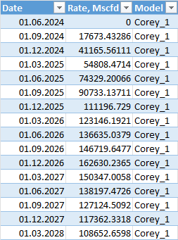 When this table is loaded into Power Query, the only transformation we apply is converting the rate from Mscfd to MMscfd and updating the header accordingly. That’s it.