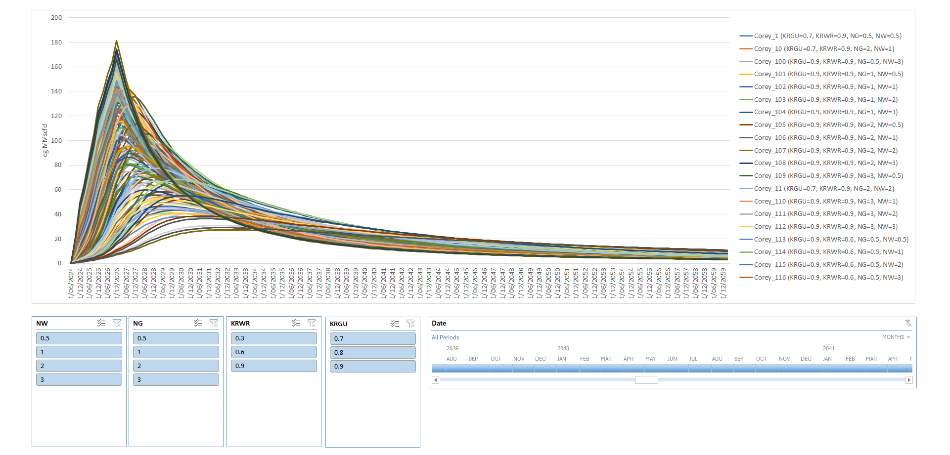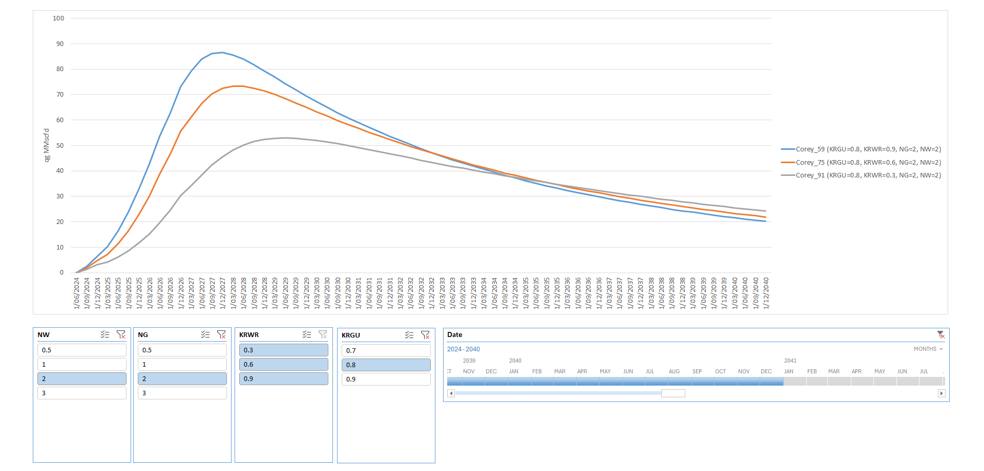 And here’s a sliced view showing gas production profiles up to 2040 (using the time slicer), isolating the impact of Krw_max (KRWR, all three buttons selected) while holding all other parameters at their base-case values (single buttons selected):